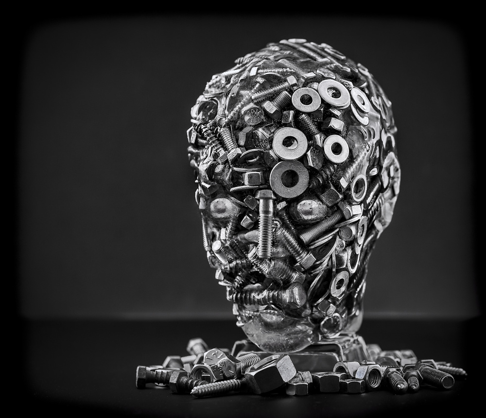 In order to create his photograph, Gene built his "Man". In his own words: "Things are sometimes not what they seem; this was the guiding notion behind the photo called "Man". "Man" is the result of my meditation on how to use normal construction materials to build an object beyond the normal use of nuts, bolts, screws and washers. So, rather than create a normal structure, "Man" was created as a still-life construction."