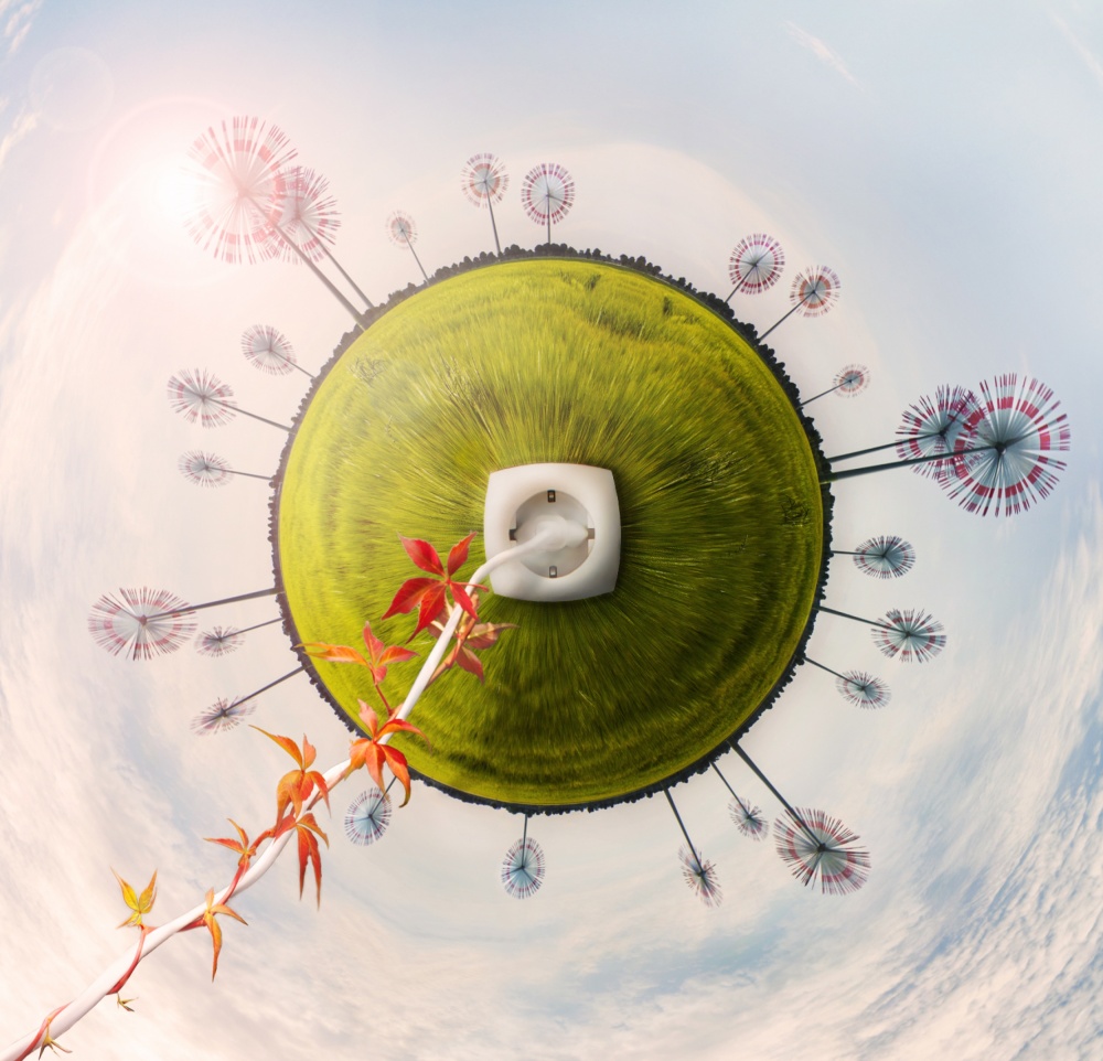 5) At first I didn't think about making a "little planet" (the technical name for it is "stereographic projection"), but when the image was finished, 1x member Ben Rea told us about a Polar Coordinates filter in Photoshop. I saw what he created with this filter, and I liked it so much that I wanted to try it too. When I was creating a few little planets with this filter, I suddenly thought about the green field with windmills: I could make this a green planet — fresh, green and happy because of renewable energy. In the middle of the planet there would be an electrical outlet from which the energy would flow through a power cord to the bottom-left corner of the frame. The idea stayed in my head for a few months until I noticed that the 1x Weekly Theme for the following week would be Energy.
