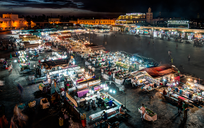 Within central Marrakech, the medina itself is photographically the most interesting area though with the exception of the Koutoubia mosque, most of the buildings are only a few stories high and there are no significant opportunities for dramatic cityscapes. If you do want a high vantage point in the Jemaa El F’naa square, a number of cafés offer roof terrace views for the price of a drink or two, though competition for space at sunset can be high.