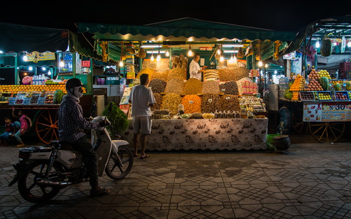 Down on the ground and within the square itself, numerous street artists perform but at the first sign of a raised camera, payment will be requested. Such tourist shots are not in any case the targets of 1x photographers but quick technique can produce some good street photography and after dusk, the brightly illuminated fruit and vegetable stalls and street food vendors become a little easier to capture. Be warned though, locals are eagle-eyed and you’re unlikely to escape any photographic expedition without a heckling or two. Be calm and polite and walk on.