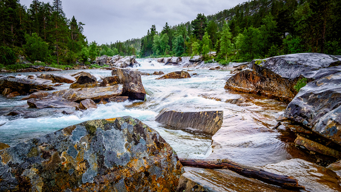 Next morning it felt good being in bed. My body underneath the quilt was comfortably warm but my nose was freezing. I had a look at the thermometer: 6º in bed and 2º outside….. I peeked through the window: fog.  Wow! Time to get out, big chance for good images.  It was 6h30 and only 15 minutes left for the first sun rays veiled by the fog, adding mystery to the forest.  But it fades fast and when I arrived at the river, the canopies of the trees were lighting up and greeting me with a show of yellows oranges and golden reds. There was music, it’s the water running in between the rocks.  The trail was like a carpet of autumn coloured leaves sneaking between the thick moss cover, red berries and  mushrooms of all shapes.  If I had turned the corner and suddenly was facing a gnome,  it would have been the most natural thing happening this place 😊