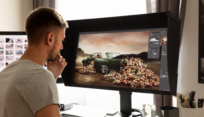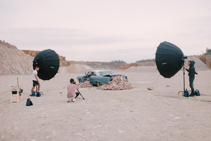 The location we have chosen for the shoot was a stone quarry close to Prague in Czech Republic. For the whole scene we used lights from FOMEI (www.fomei.com), as you can see on the backstage footage. The credit for these beautiful backstage photos captured throughout the whole day goes to the photographer Milan Vopálenský (www.milanvopalensky.com). We used 3 battery lights of 600ws with different types of soft boxes. The intention was to build quite heavy but poetic movie atmosphere. The week before the shoot we were constantly following the weather forecast and it seemed it would rain the whole day. Eventually the rain combined with the sunset played huge role in creating the most beautiful movie scene. After the shoot, the great support and my base in the whole post-production process is premium graphic display monitor EIZO CG318-4K. Thanks to this equipment I am able to focus on the very detailed adjustments in the process of creating the fine art piece.