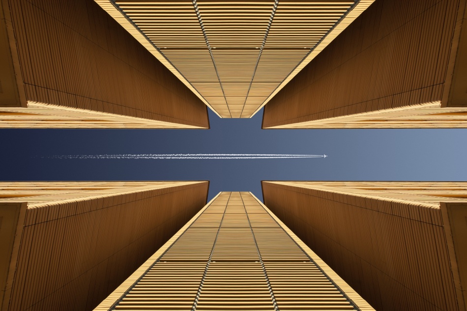 The fisheye perspective makes it possible to photograph a subject from relative proximity and still capture the surroundings almost completely - as in our example the airplane and the skyscrapers around it.