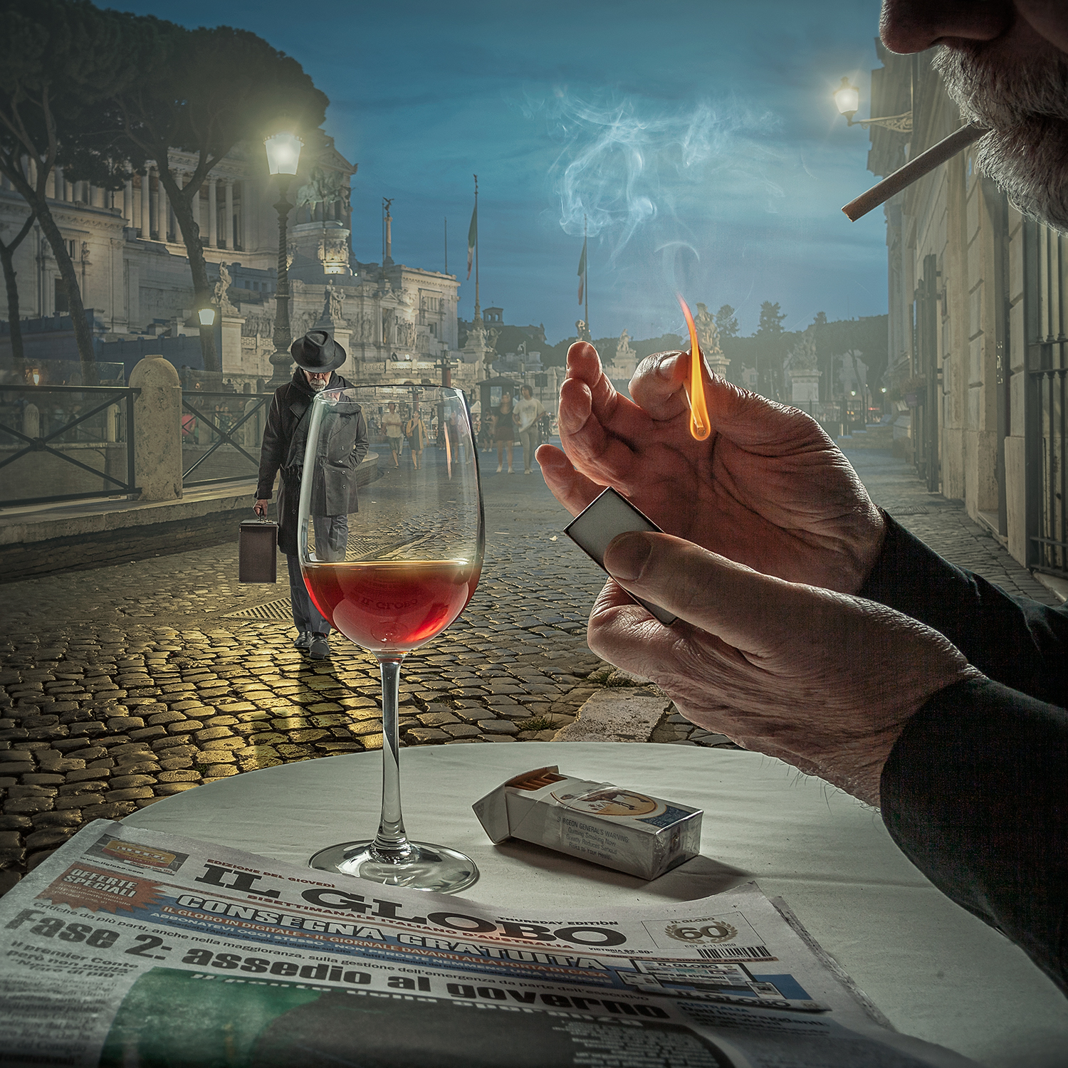 For a number of years now, my work has focussed on the ‘Lonely Man’ series. These works feature my fedora-hatted protagonist in images that tell stories of mystery and intrigue, or isolation and alienation. I try to achieve the look of a film noir movie still, emphasizing moody lighting and a sense of drama. My early works were essentially street photography captures; however, I would use post-processing to achieve a surreal other-worldly look to them. Over time, I realized that I could achieve more creativity and storytelling potential via the use of composite photography. So I began capturing figures in my home studio, where I could control the lighting and the poses and also have the capacity to place the figures in the scene where I wanted them.