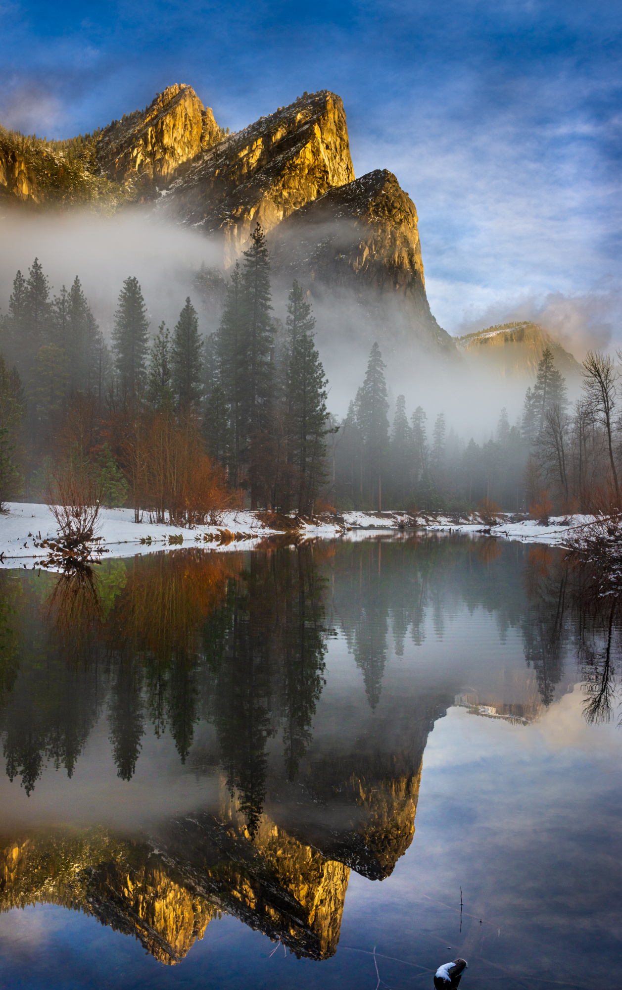 Our favourite photo is the one taken at the Tunnel View Yosemite NP.  hat day, a lot of people were waiting at that famous spot. The weather was changing all the time. Sometimes, It was sunny with partial clouds; sometimes it was drizzling or snowing.  More and more people left, predicting it would be cloudy and no hope to see the golden light at sunset.  About 30 minutes before the sunset, the last two so called professionals from Beverly Hills left though we tried to persuade them to stay. By the end, we were the only ones standing with our tripod and camera on that big spot which could hold 50 more photographers. Suddenly, a golden sunbeam hit the bottom of the valley, and then it was moving upward on El Capitan.  More golden sunbeams showed their interest in Half Dome and Cathedral Rocks etc.  Some of the moving clouds enjoyed sunset light, too.  What a beautiful and fantastic drama performing just in front of us!  We were so excited and kept the shutter clicking. We were in a very happy mood!  Persistence and patience played a big role here.  We have been to this location many times, but this is one of the most exciting moments.