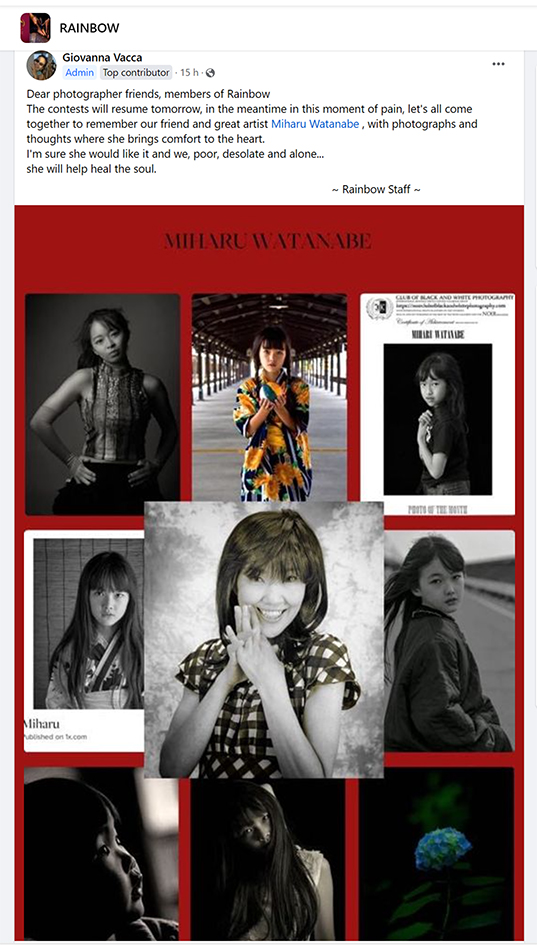 | Makoto Inaba PRO I am very confused by the news of her death. I remember meeting her last September and talking about our photography like it was yesterday. We just confirmed to each other the other day that we are both looking forward to seeing each other again at the 1X Artist Exhibition next year.