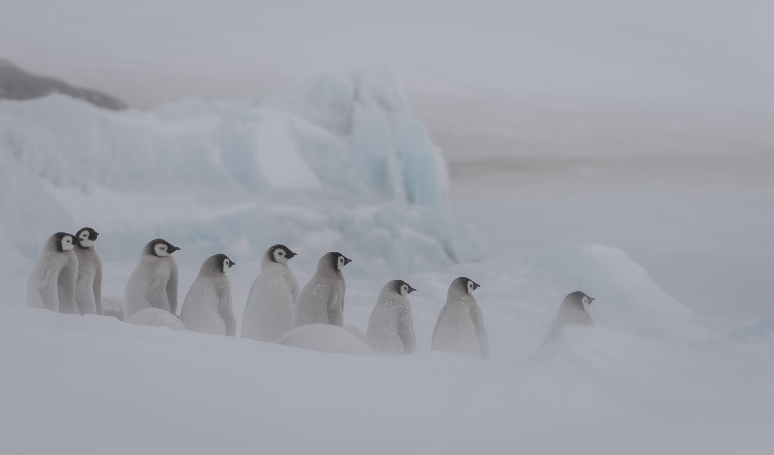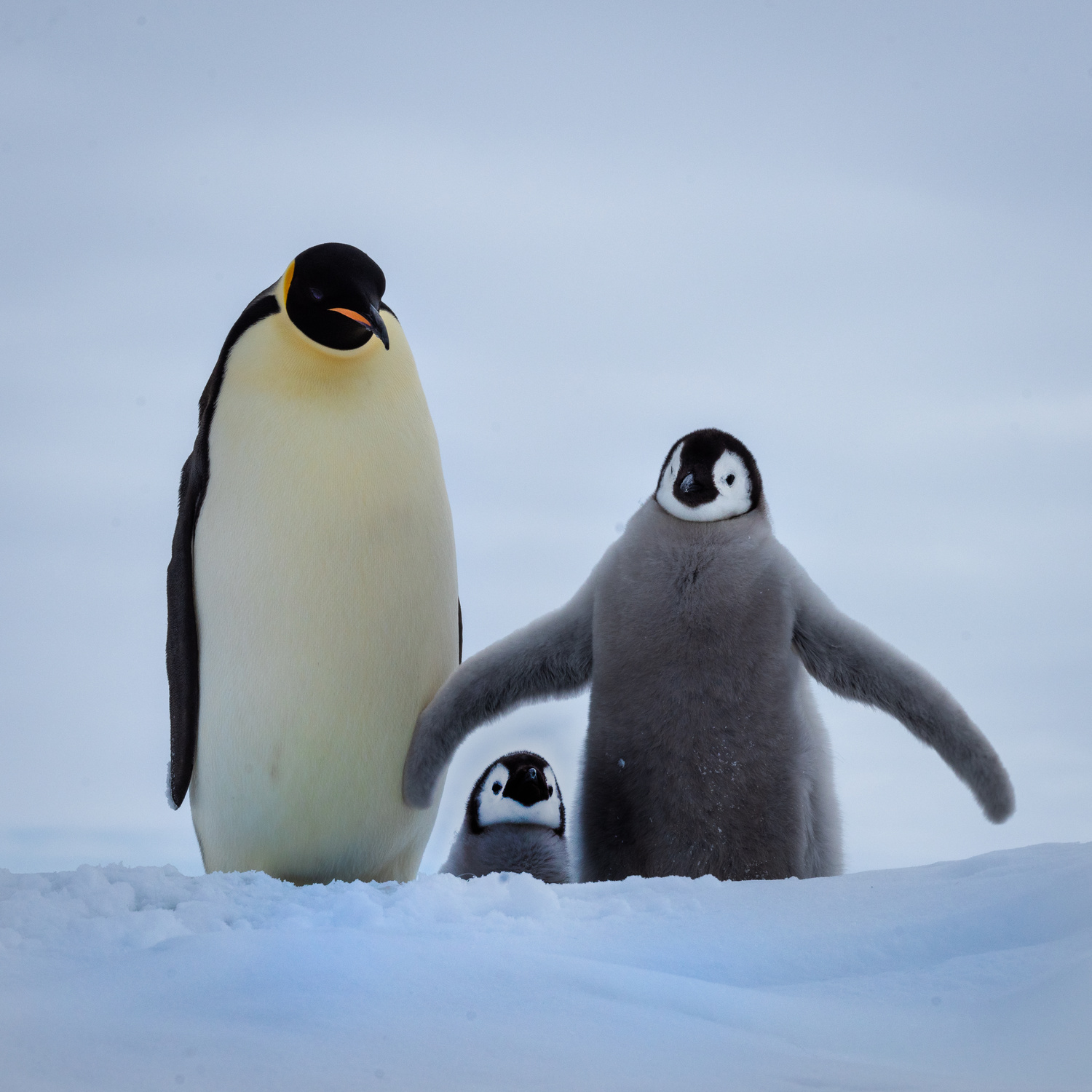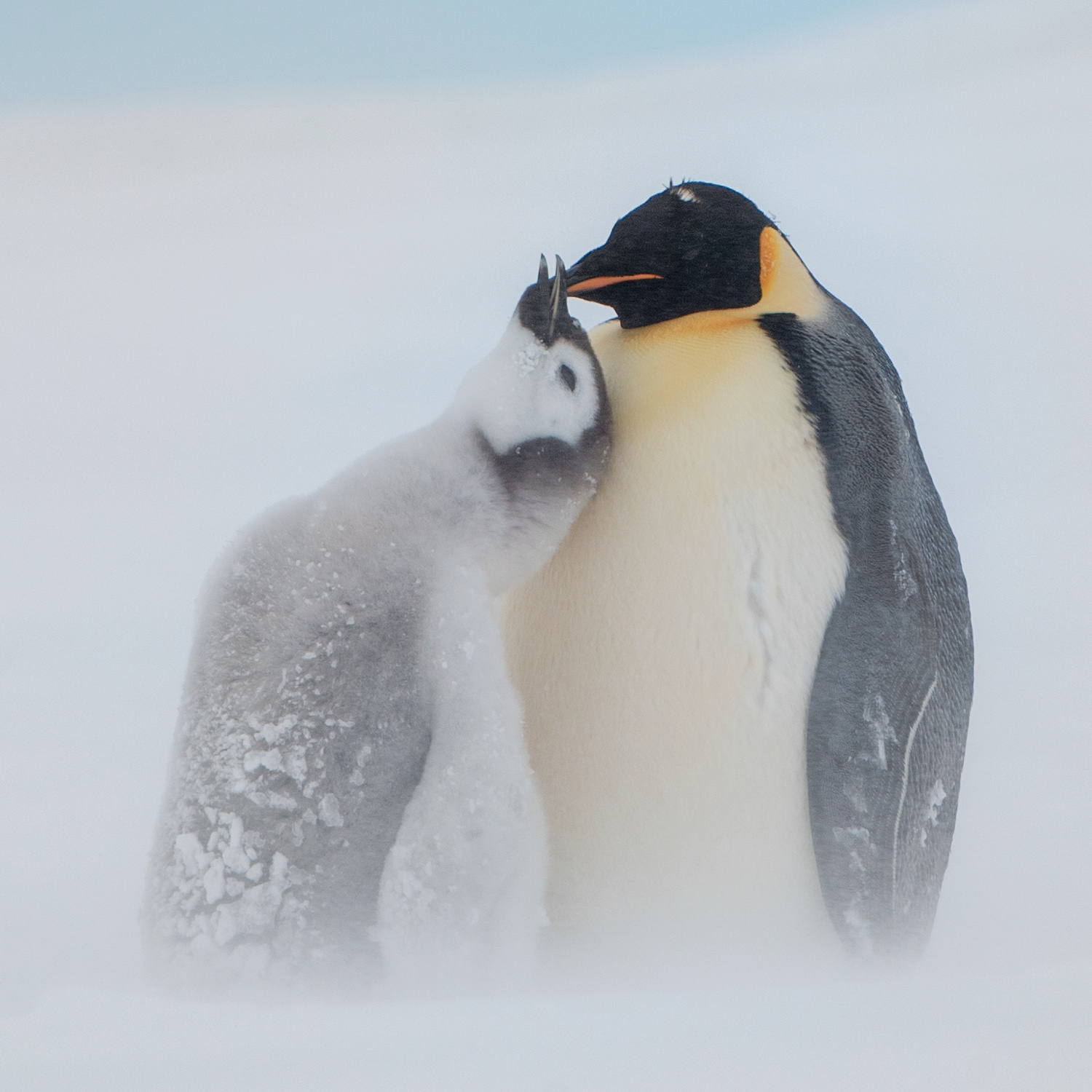 Snow Hill Island is home to up to 10,000 Emperor Penguins, making it the northernmost location on the continent where these penguins can be found. Wild Emperor penguins are only found in Antarctica. They breed and raise their young mostly on ‘fast ice’, a floating platform of frozen ocean which is connected to the land or to ice shelves. From birth, they spend their entire lives in and around the Antarctic ice, although very rarely vagrants have turned up off the coast of New Zealand. Emperors are the biggest of the 18 species of penguin found today, and one of the largest of all birds. They are approximately 120cm tall (about the height of a six year old child) and weigh in at around 40 kg, though their weight does fluctuate dramatically throughout the year. Emperors are the least common Antarctic penguin, with global population estimates of 265,500–278,500 breeding pairs. Emperor penguin colonies have been discovered and counted from space. For the last 15 years, British Antarctic Survey (BAS) scientists have been looking for new colonies by searching satellite imagery for their guano stains on the ice. There are now 66 known emperor penguin colonies around the coastline of Antarctica. Emperors incubate their eggs during the long dark southern winter months. Courtship displays are intricate but copulation is quick and the female lays a single egg in May or June. She then passes it over to her mate to incubate - and she’s off. She spends the next nine weeks at sea, feeding. The male carefully balances the egg on his feet for between 65 – 75 days to keep it warm in a specially adapted brood pouch, and off the snow surface, before it hatches. Emperors are uniquely adapted to survive these harsh conditions when temperatures can drop down to a bone chilling -50°C and with winds of up to 200km/hr. They have two layers of feathers, a good reserve of fat and proportionally smaller beaks and flippers than other penguins to prevent heat loss. Emperors also have feathers on their legs, so their ankles don’t get too chilly. Even their feet are adapted to the icy conditions, containing special fats that prevent them from freezing and strong claws for gripping the ice. But most remarkably, colonies of adults and chicks work together to huddle for warmth. 5,000 or more tightly packed adults and chicks shuffle around, so each takes a turn - but not too long - on the outside of the huddle where it’s cold. This is in complete contrast to their quarrelsome and territorial neighbours, the Adélie penguins. Their strong sense of community literally keeps them alive. Their impressive size and colour makes them extremely popular and a favourite subject for wildlife photography.