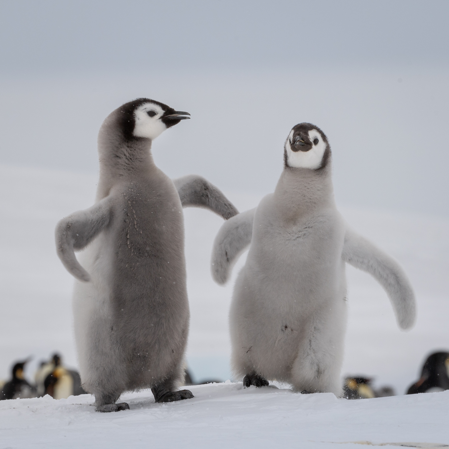 'No tickle please, Dad-Emperor penguin chick with dad behind'